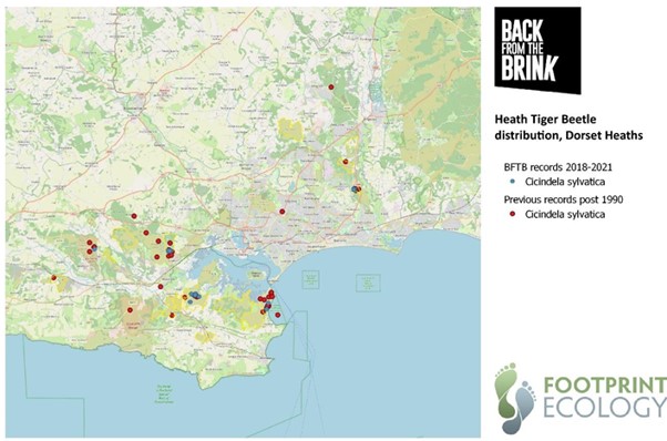 Distribution records for the heath tiger beetle within Dorset heathland. Red dots show previous records post 1990 and blue dots show Back From The Brink records between 2018-2021 © Footprint Ecology and DERC